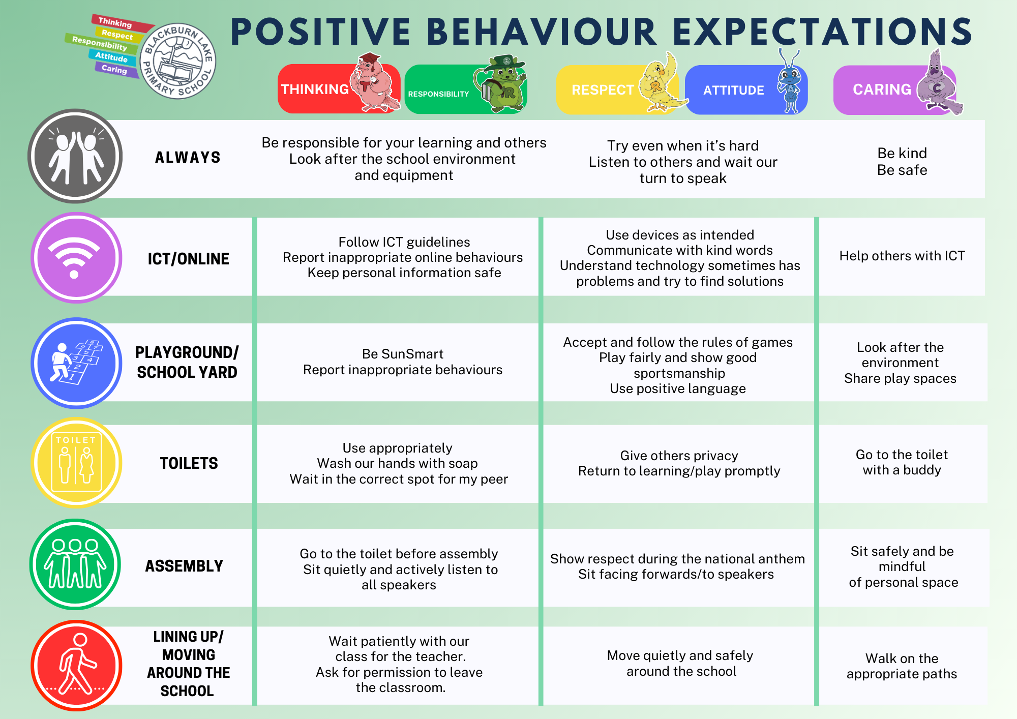 At BLPS we have developed a Positive Behaviours Matrix which clearly outlines to all students, staff and the school community the expected behaviours in all settings of the school. Our matrix is prominently displayed around the school, and has been grouped in accordance to our school TRRAC values.